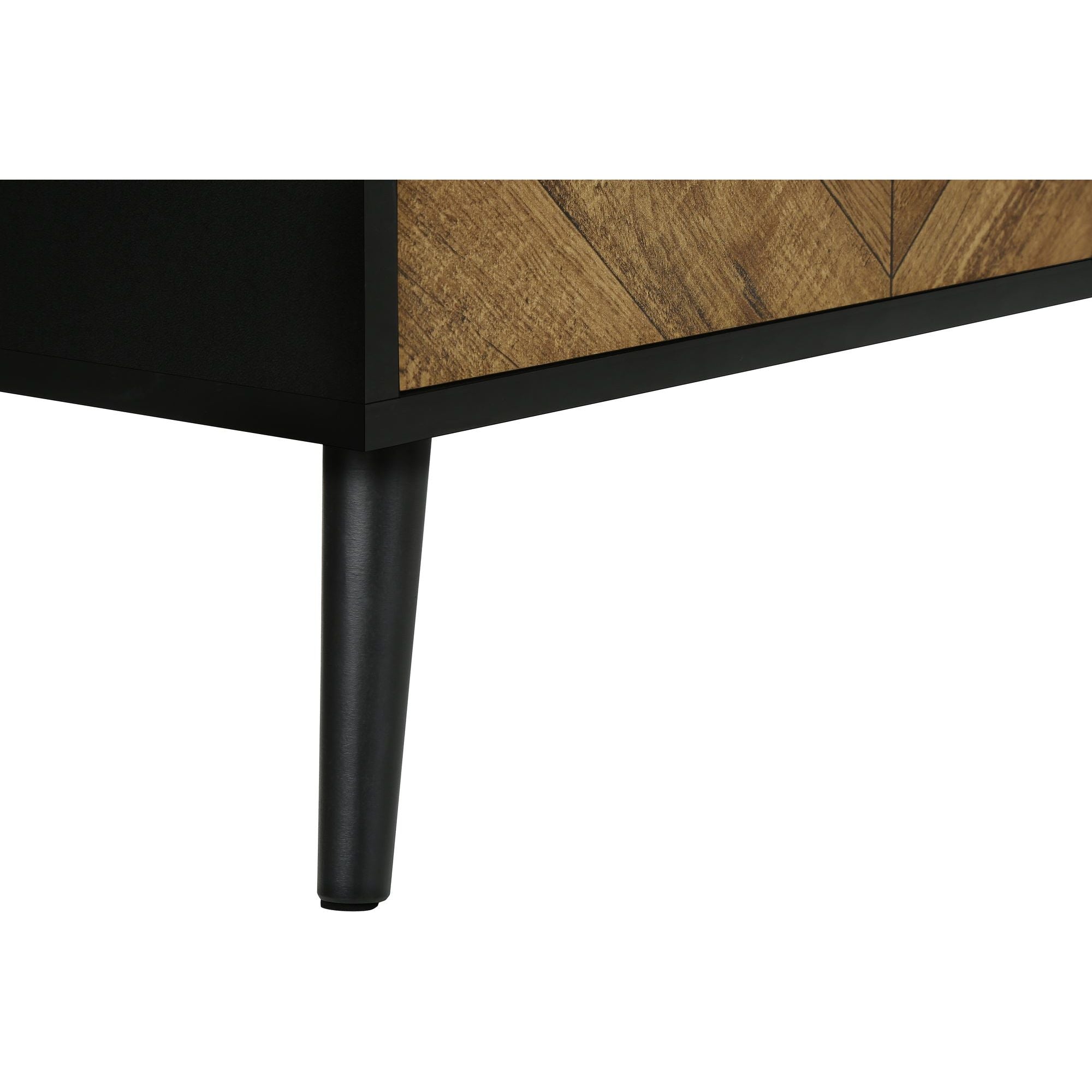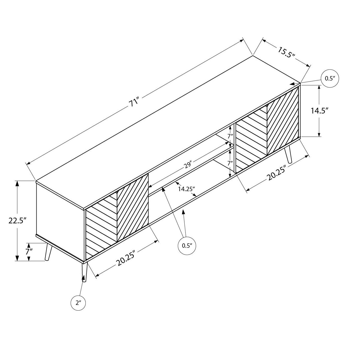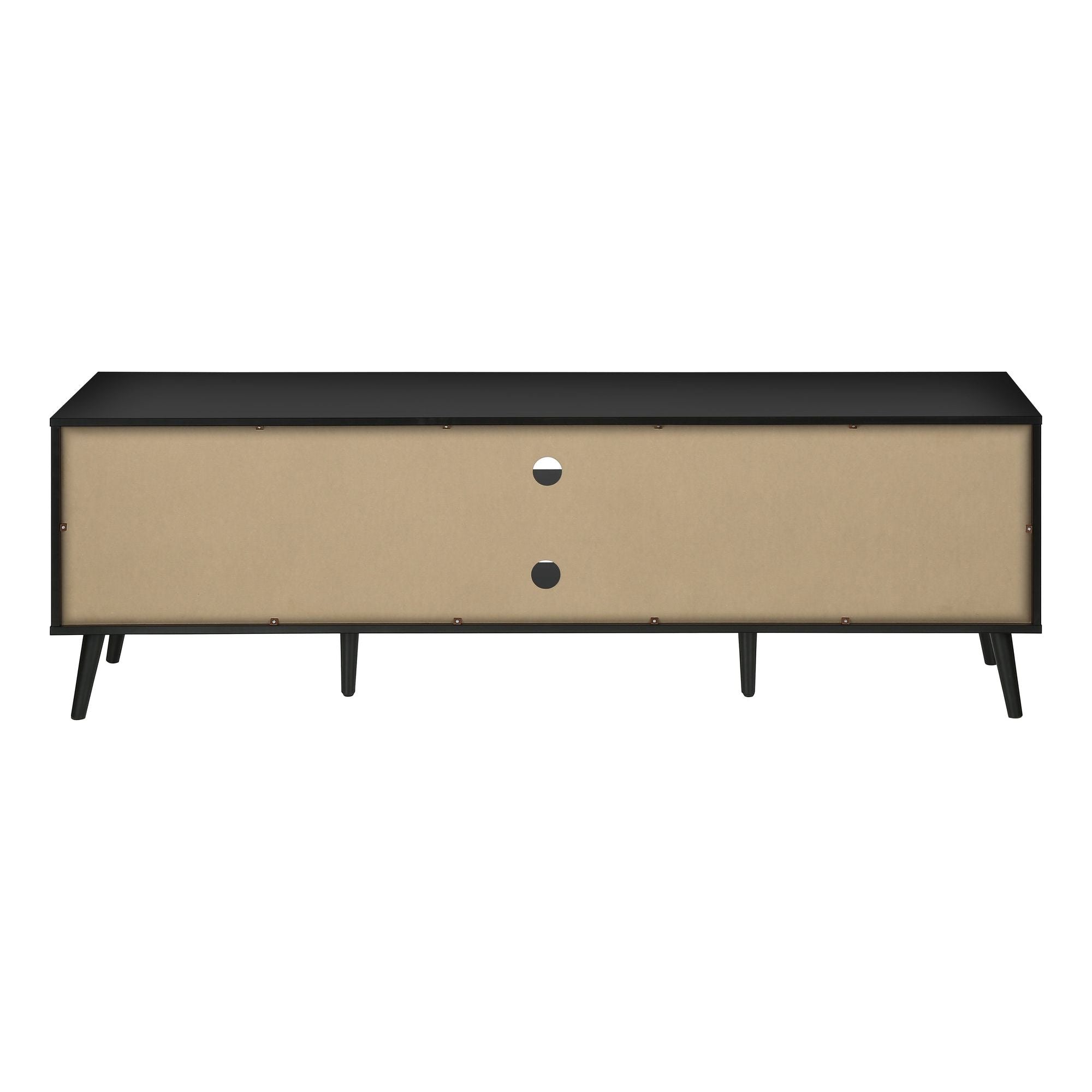 Make a modern statement and stay organized with this 72 inch tv stand. Featuring a brown and black laminate finish with durably designed black wood legs, and slanted groove lines on the wood-look doors give this tv console unit a unique and stylish contemporary flair. The two wire management holes behind the fixed shelf provide efficient storage and organization, and the two closed cabinets with a push latch mechanism make opening and closing easy to access books, media and gaming accessories. With a 5 year limited warranty for manufacturer's defects, it ensures that you can enjoy this tv stand for years to come without worry. Easy to assemble with full illustrated instructions included, this console is perfect as your all inclusive media entertainment center for your living room, bedroom, or office space.