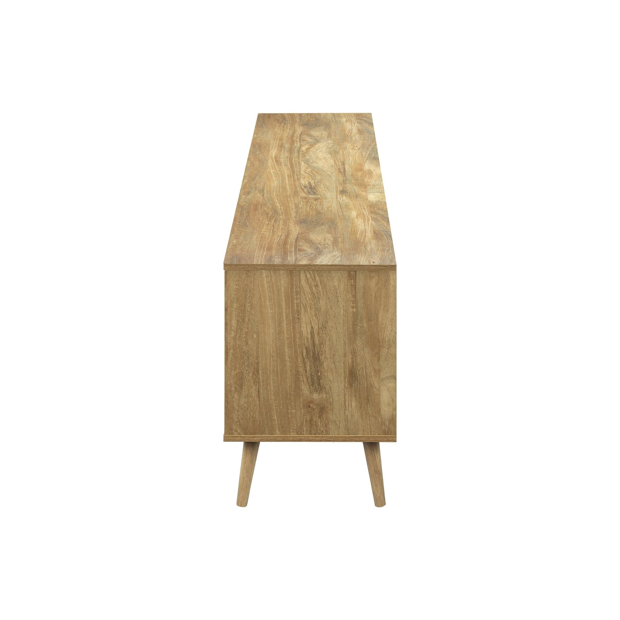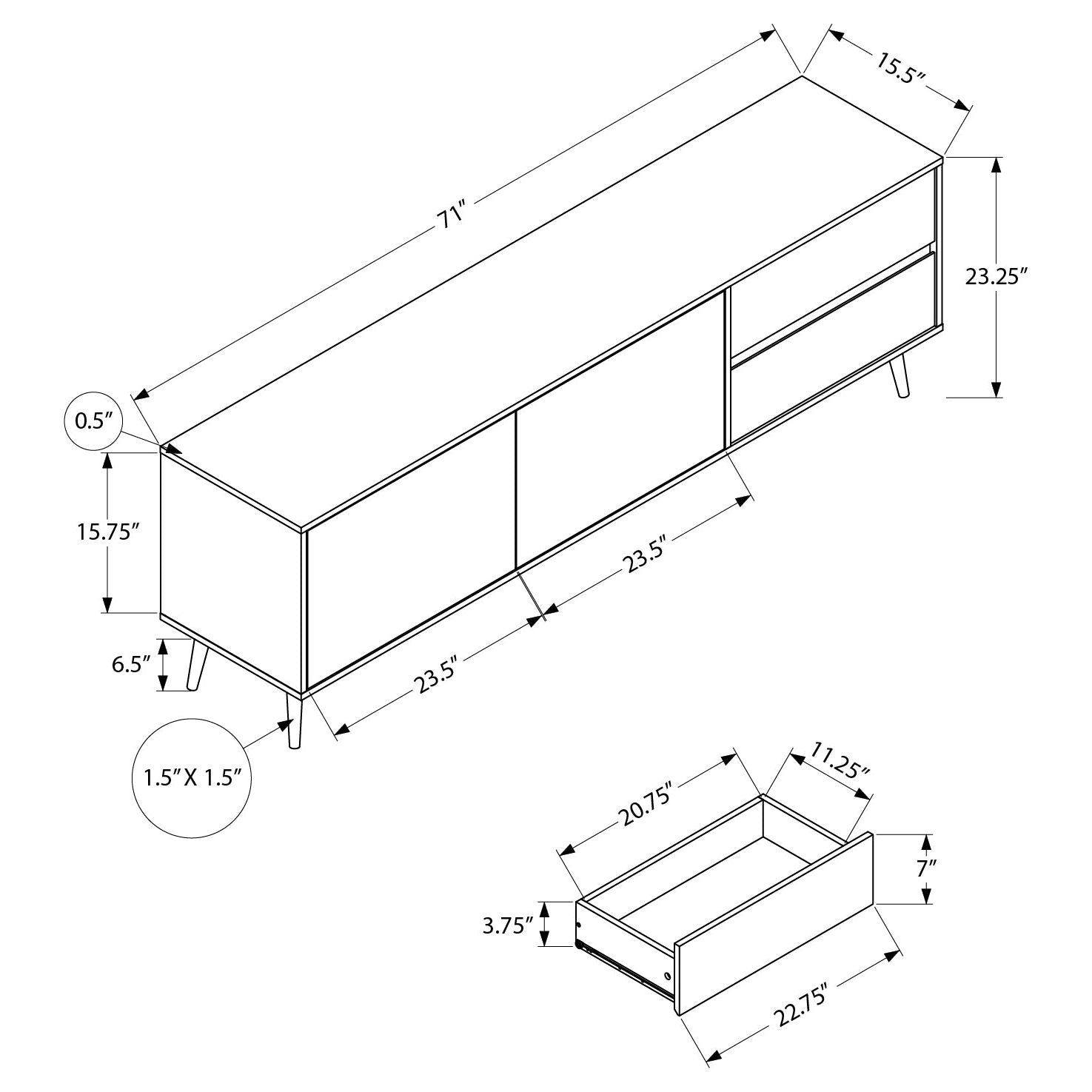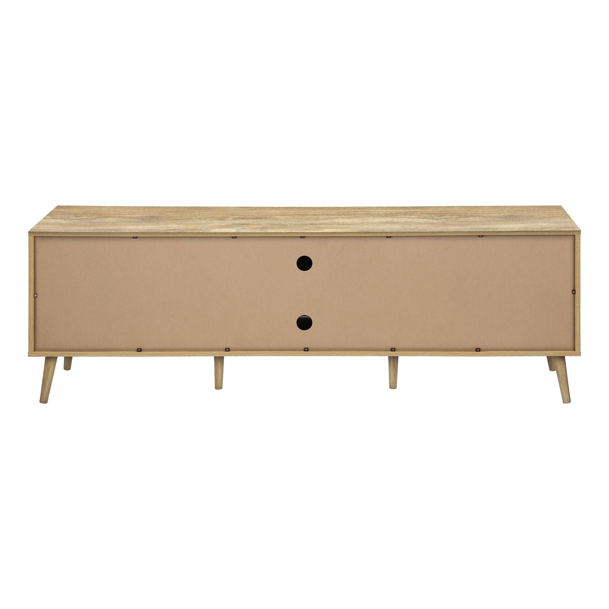 Make a statement in your living room, family room, or bedroom with this trendy tv stand in a mid-century design with a light walnut laminate finish. This 72 inch console boasts a retro style that is both fashionable and functional. The durably designed piece features solid wood legs with an easy to clean top for care-free maintenance. The 2 easy-glide closed storage drawers and 2 storage cabinets with an adjustable shelf in each, helps to keep your media essentials organized and out of sight. The push latch mechanism adds a modern touch, while the 2 cable management holes in the back keeps cords tidy. This fashionable style tv stand is also easy to assemble with illustrated instructions and all hardware included. For your convenience, this media console is backed by a 5 year limited warranty against manufacturer defects, ensuring a long lasting, quality furniture piece. Built with solid construction, you will enjoy this media entertainment center for years to come.