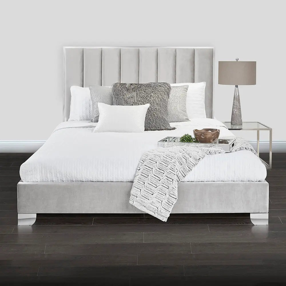 Uriel Grey Velvet King Bed With Steel-Framed Headboard