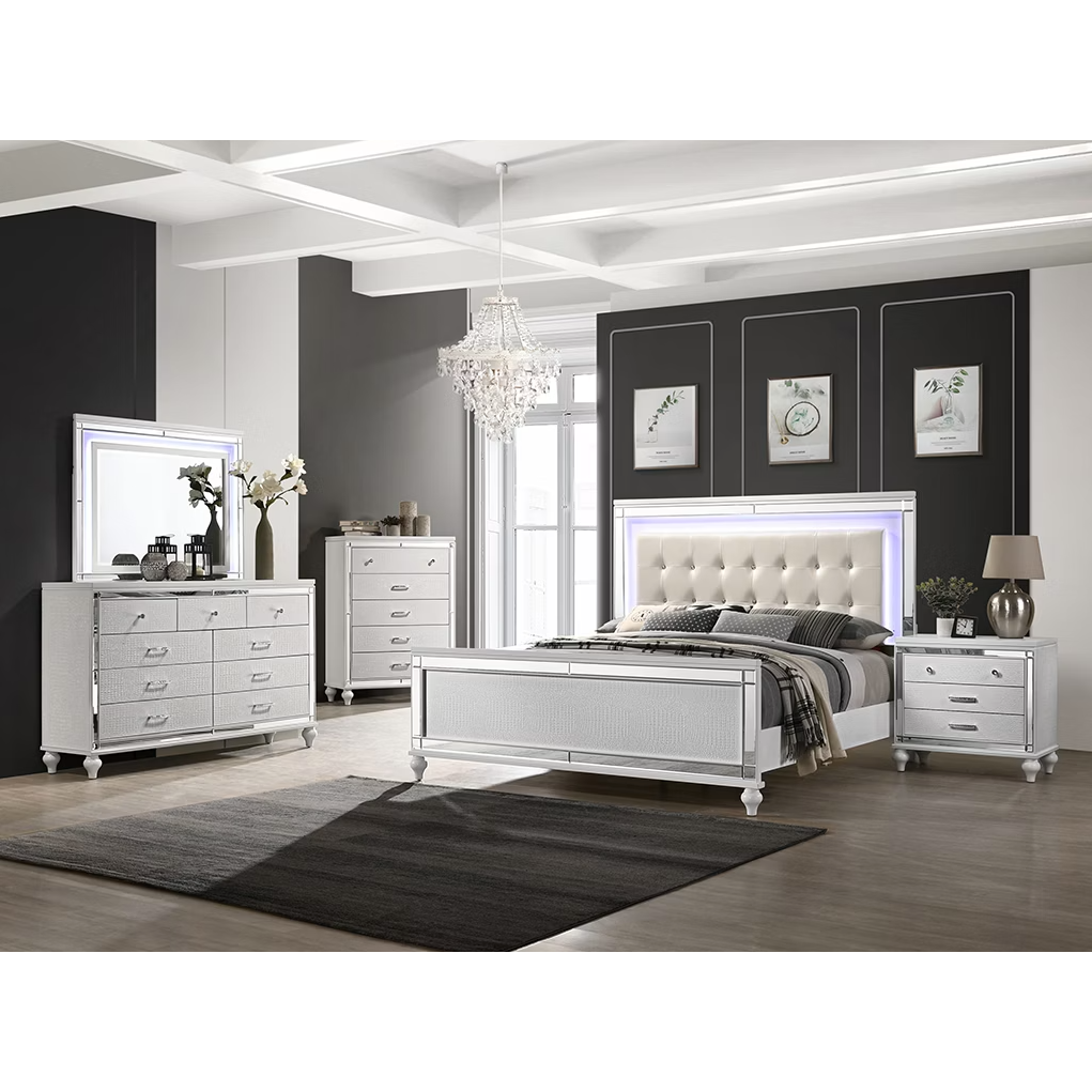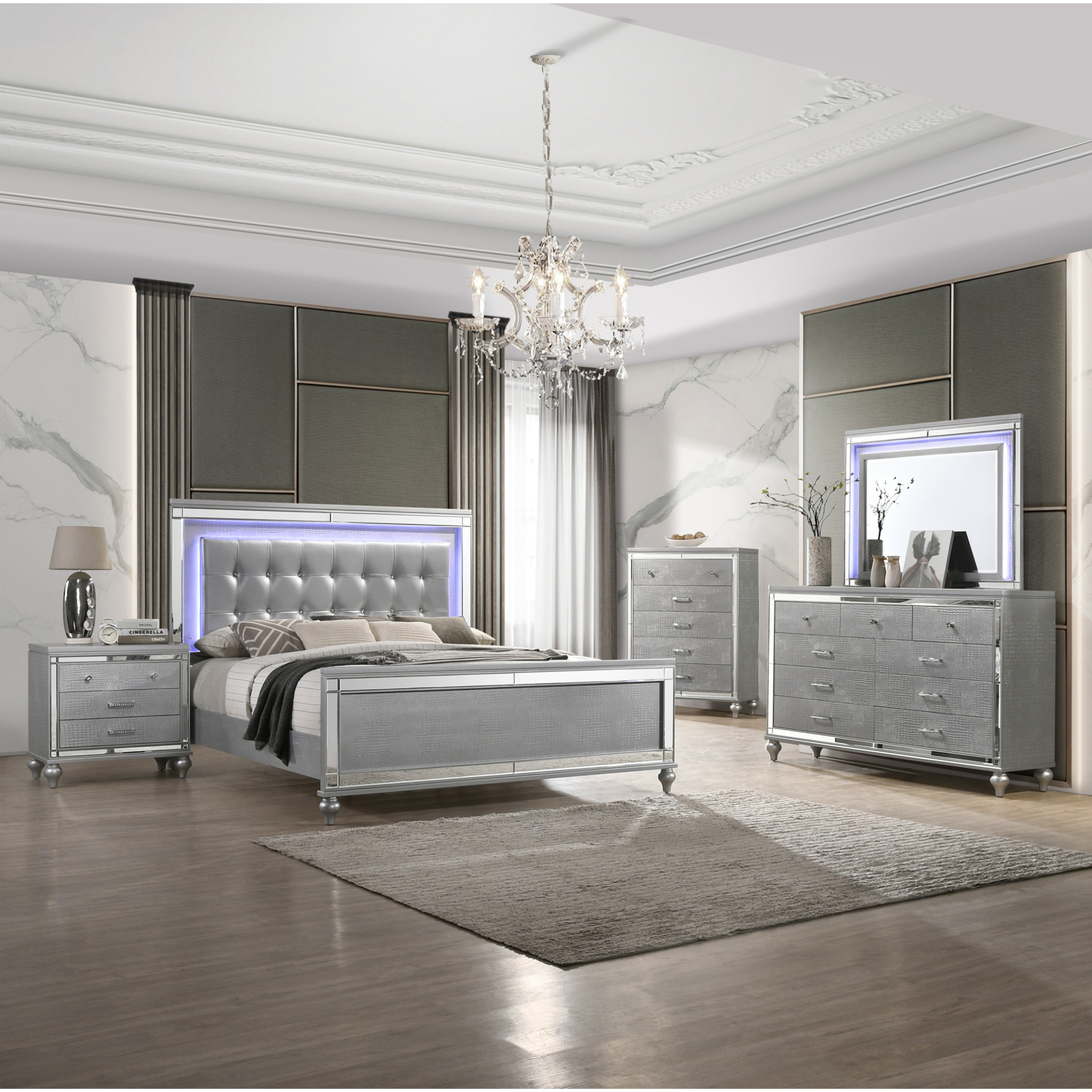 Featuring a lighted and upholstered headboard, the Valentino Silver Upholstered Panel Bedroom Set is brimming with features. Embossed inlays, mirrored borders, and turned feet all add to the unique styling of this suite.