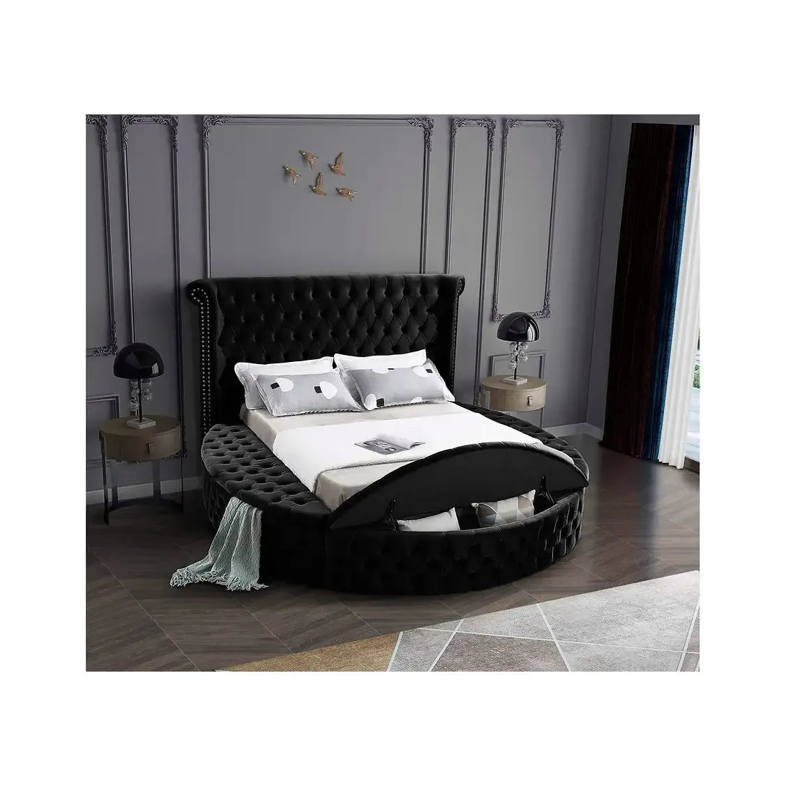 - Queen-size velvet bed with deep button tufting