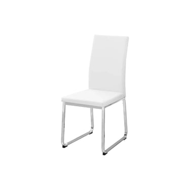 Add a designer touch and comfort to your dining space with this set of 2 modern white leather-looking dining chairs. These dining chairs are made of a smooth, upholstered white leather-like material with sturdy contemporary chrome metal bases. Enjoy the comfortable seat that will create a vibe in your small home or apartment. These armless dining room chairs will slide perfectly under the table to save space when not in use.