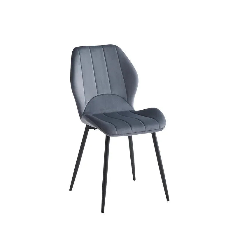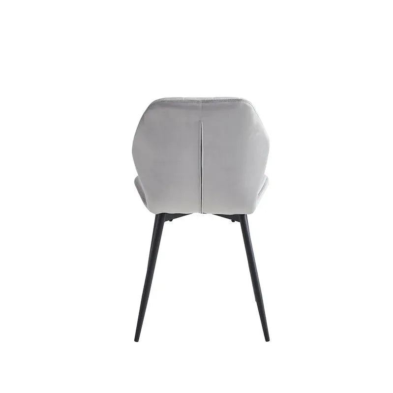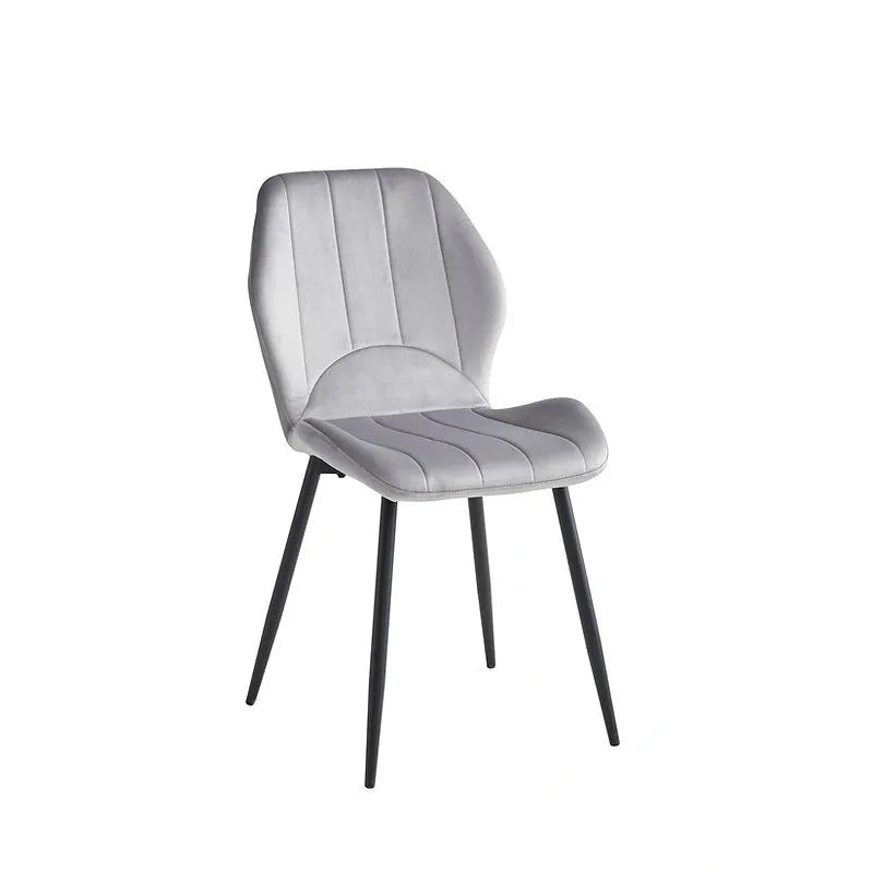 Choose your chair vibe: light grey velvet or dark grey velvet, each with crisp stitching details and cushioned seating. The chairs feature supportive backs and sturdy black steel legs.