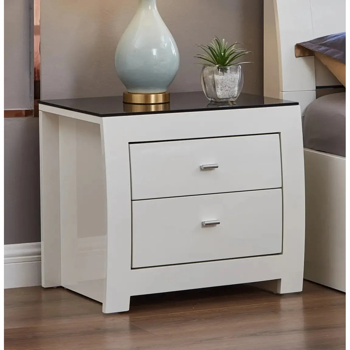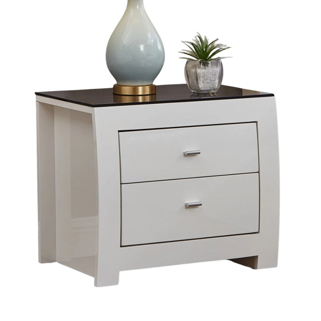 Upgrade your bedroom with this stylish nightstand with drawers. The white high-gloss finish combined with a sleek black glass top gives it a modern, luxurious look.
