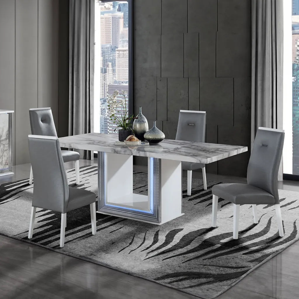Bold. Elegant. Unforgettable. The YLIME white marble dining set instantly elevates any space with its striking modern look and high-gloss finishes. It’s not just a dining table—it’s a conversation starter. Let’s talk about that base. The geometric pedestal glows with built-in LED accent lighting. It's futuristic but warm. It sets the mood instantly. Romantic dinner? Family gathering? It fits both. The faux white marble tabletop is spacious, luxurious, and easy to clean. It’s sleek. It’s stunning. And it’s built for real life.