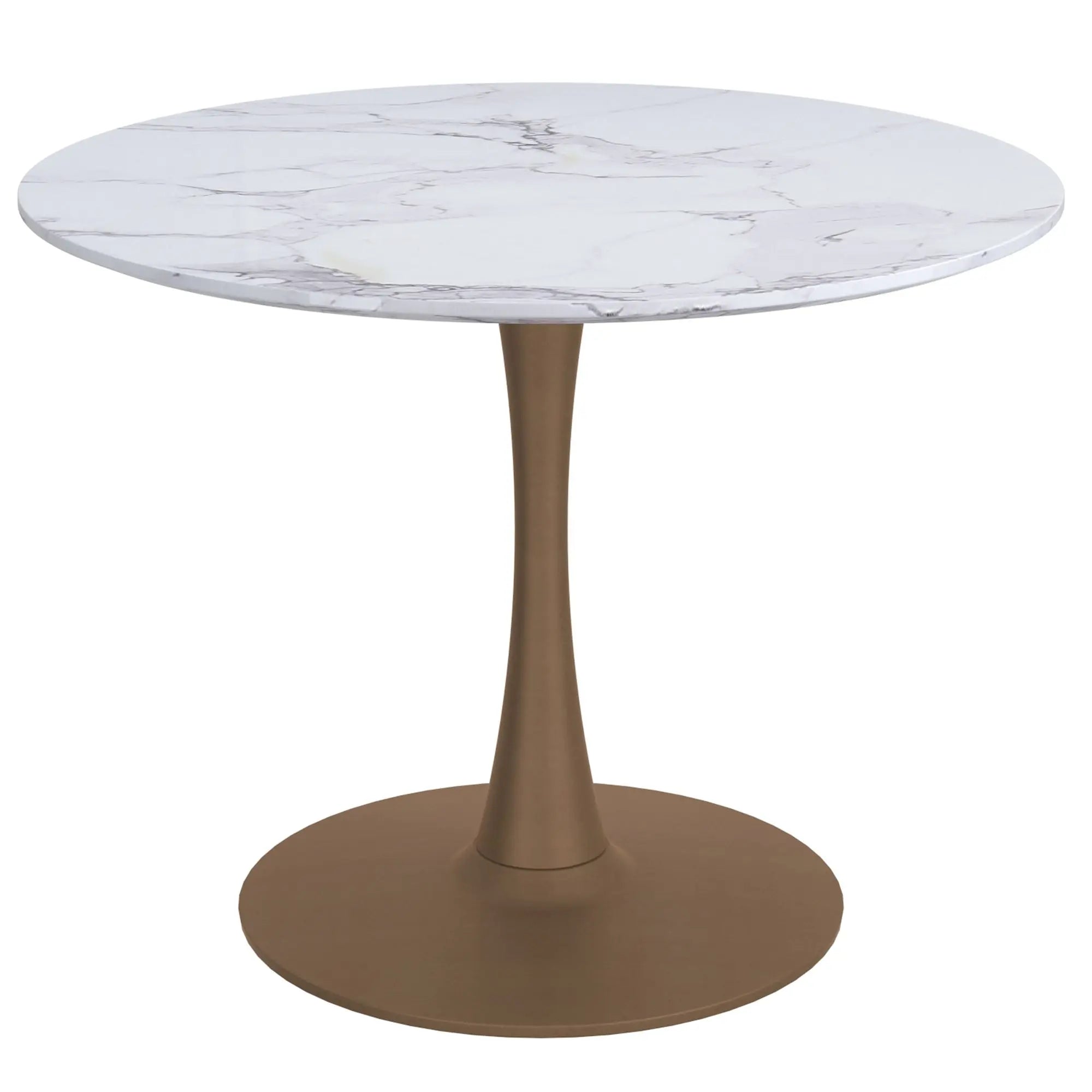 Round table with marble top and brown base on a white background