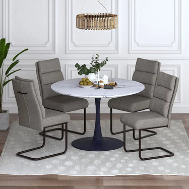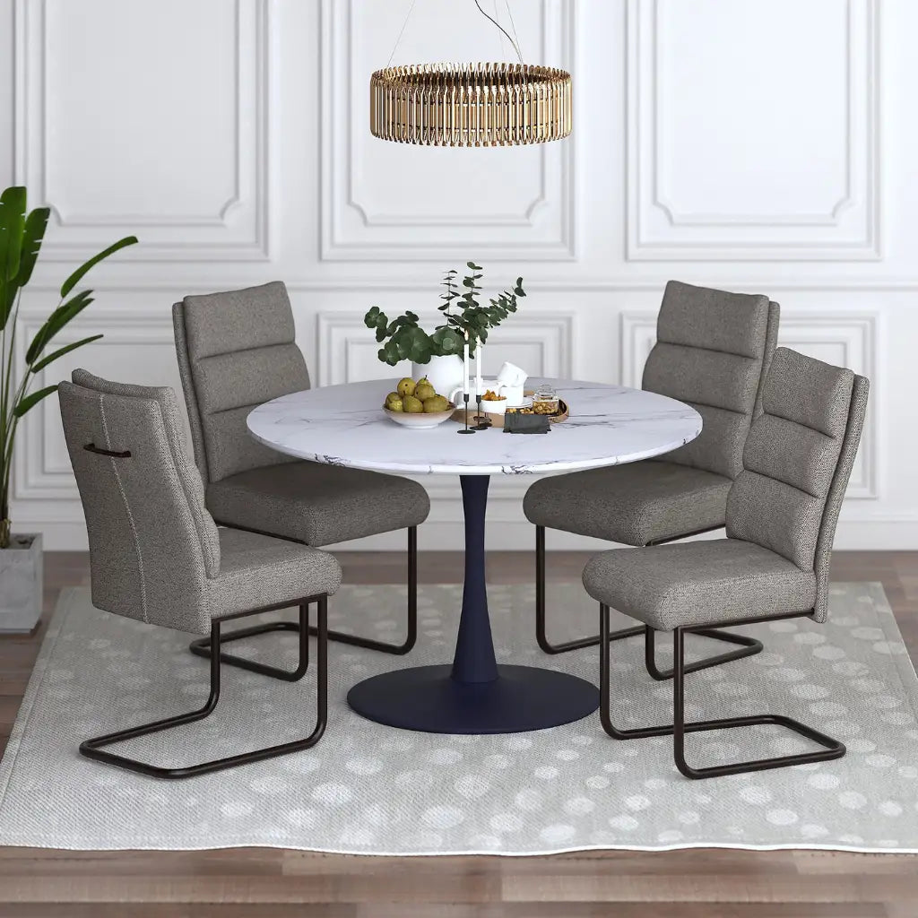 Meet the Zilo/Brodi round black dining table set—where modern elegance meets everyday functionality. The 47.25-inch round tabletop steals the show with its gorgeous faux marble finish. Smooth. Bold. Eye-catching. The matte black pedestal base gives it a modern vibe while ensuring rock-solid stability.